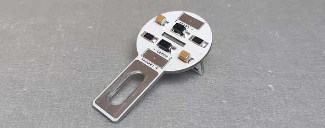 Sur la mini carte d'insert, sont notifiées les zones de soudures LAMPES + et Lampes1 Lampes2 - qui sont les polarités à respecter (le +lampes va sur le fil chaîné sur le plateau avec la vis et le - lampes va en direction de la driver)