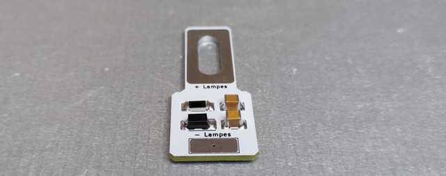 Sur la mini carte d'insert, sont notifiées les zones de soudures LAMPES + et Lampes - qui sont les polarités à respecter